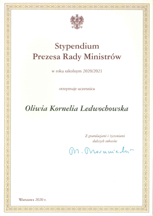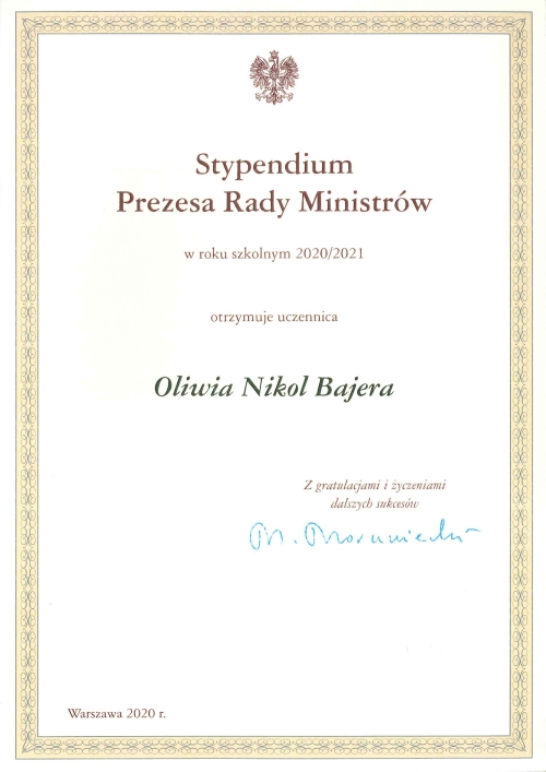 Z przyjemnością informujemy, że stypendium Prezesa Rady Ministrów otrzymały dwie nasze uczennice: Oliwa Bajera z klasy 3a oraz Oliwia Ledwochowska z klasy 2a.