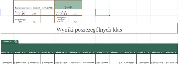 Do rzeczywistej wartości liczby pi najbardziej zbliżyły się klasa 1A i 4C. Wyniki doświadczenia przedstawiamy poniżej.
