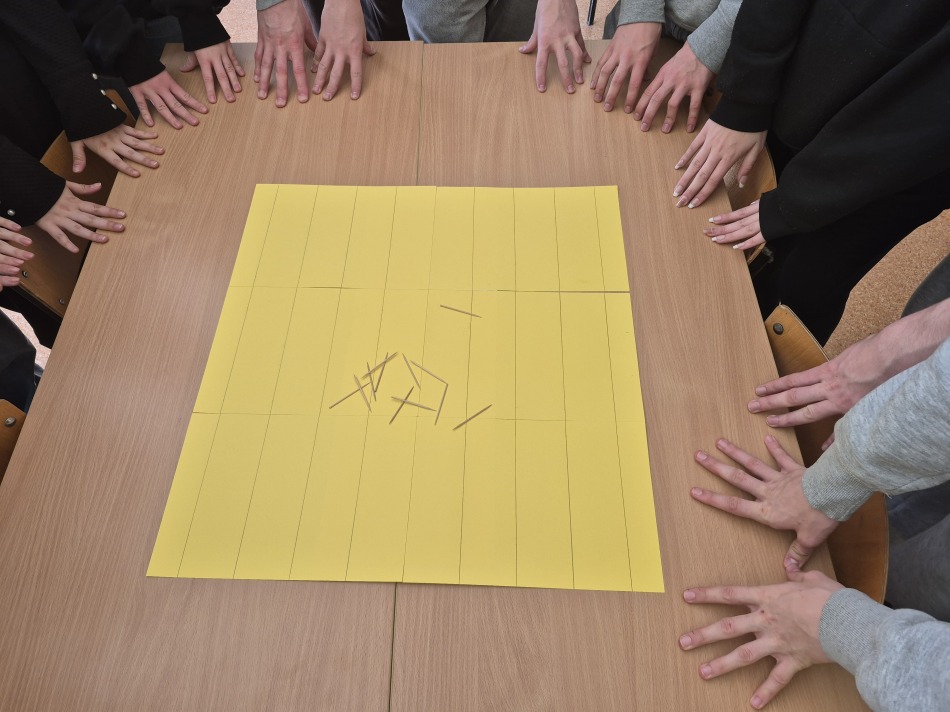 Eksperyment polegał na rzucaniu igłą (u nas tę funkcję pełniły wykałaczki) na powierzchnię podzieloną równoległymi liniami o odstępach równych długości igły. Następnie zliczaliśmy, ile igieł spadło na linie. Więcej na temat Igły Buffona można przeczytać tutaj: https://pl.wikipedia.org/wiki/Ig%C5%82a_Buffona